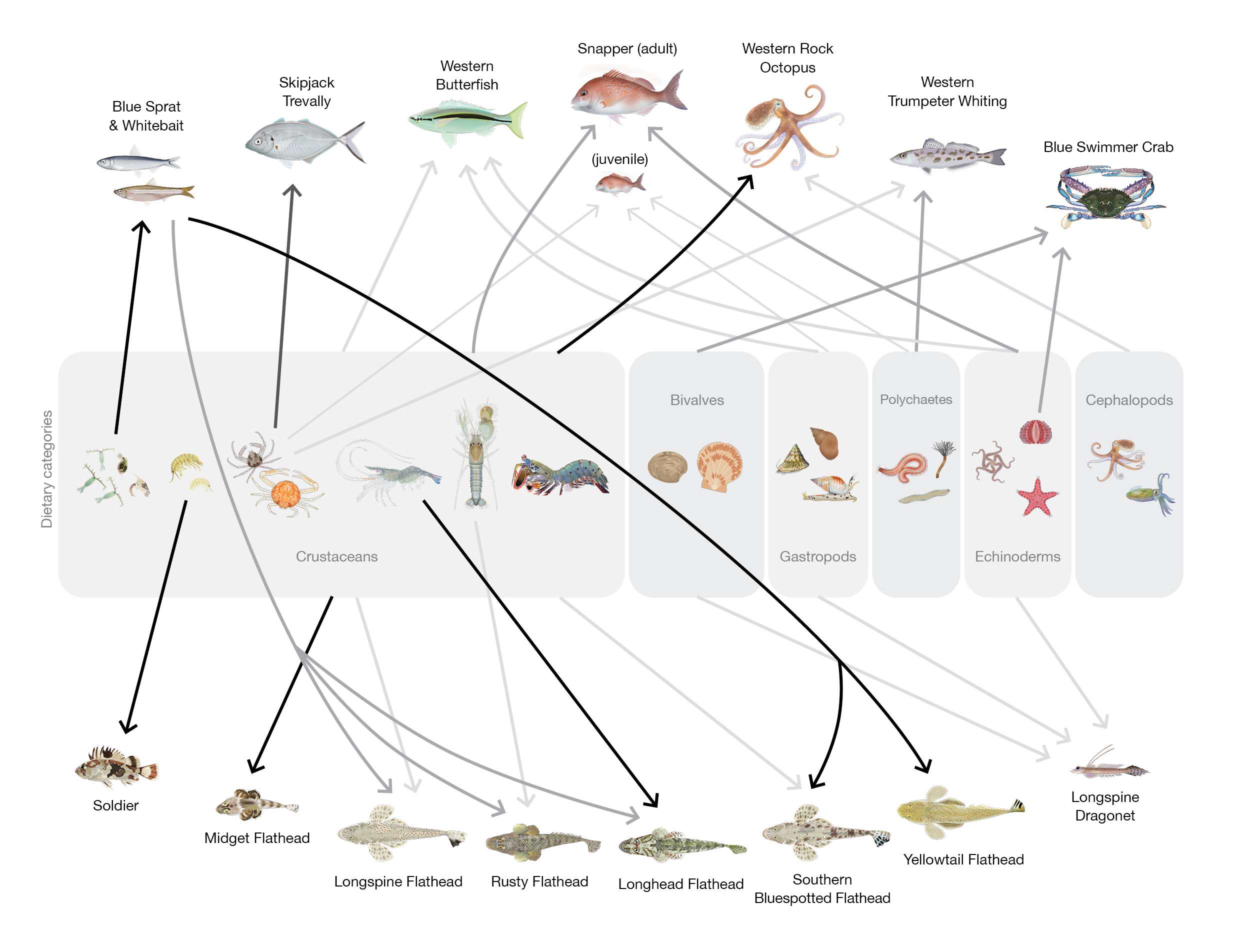While at early stages, the conceptual foodweb below based on GCA alone shows the major prey items consumed by fishery species, with bold lines denoting prey making a particularly large contribution to the diet of a predator. Research will be built upon in 2023 to help inform investigations being completed as part of the Westport Program for the proposed terminal in Kwinana.